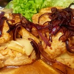 Куриные грудки с начинкой из яблок, сыра и карамелизированного лука. Вечная проблема у меня в семье: несмотря на все мои доводы, что курица с костями намного сочнее и интереснее в готовке, мои домочадцы называют ее "мeртвой птицей" и признают только куриное филе!!! Вот и выискивала я намедни рецепты в глобальной сети, чтобы хоть чуток "развеселить" белое мясо цивилизации... Нашла американский рецепт рулетиков из куриных грудок, начиненных яблоками и сыром... Замариновала с вечера куриные грудки... Но следующий день выдался таким напряженным, что рулеты вертеть было некогда... Но вкус от этого не пострадал...