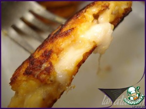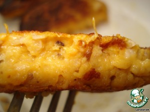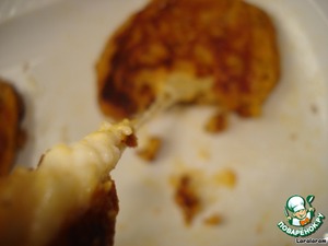 Кладём в горячее масло ложкой тесто (нетолсто!), ещё будет второй этаж и припёк! Посередине каждого оладушка кусочек сыра или горочку натёртого, а сверху прикрываем всё это тестом, берём уже меньше, чем на первый этаж... Главное, чтоб тесто покрыло сыр.