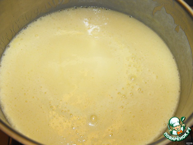 В большой кастрюле растворить на плите мёд с маслом и маргарином, добавить соду, хорошо размешать венчиком (или миксером) и снять с огня.