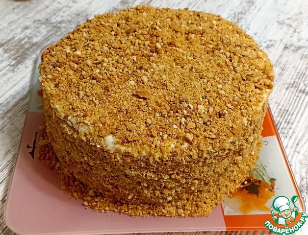 Обсыпать весь торт крошкой и сверху аккуратно присыпать орехами.