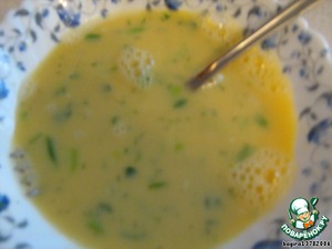 Пока бульон закипает, разотрем желтки, постепенно добавляя 3 ст. л. оливкового масла. Затем маленькими порциями вольем бульон, который мы отобрали, и все хорошенько размешаем.