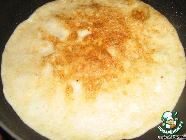 Белки солим, добавляем немного сухого перца чили и поджариваем тонкий омлет (по желанию его можно перевернуть, как блин). -