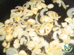 Лук режем полукольцами, 5-6 зубков чеснока-колечками - обжариваем все до золотистого цвета. Не пережигаем! -