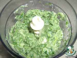 После того как сварится чеснок, вылавливаем его из бульона (удобно пользоваться ложечкой с дырочками) и вместе с зеленью измельчаем в блендере. Если у блендера имеется специальная насадка, эту процедуру можно "провернуть" прямо в кастрюле.