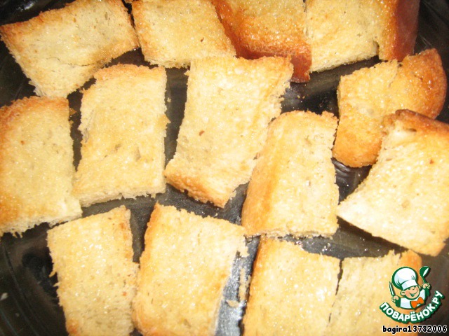 Пока варится бульон, ломтики хлеба нарезаем на небольшие кусочки, поливаем маслом, оставшимся после жарки чеснока и лука и подсушиваем в духовке.
