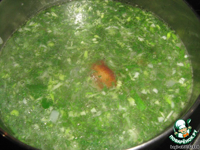 Вливаем все обратно в бульон, добавляем мясо и даем закипеть. Затем отбираем один половничек отдельно в чашку.