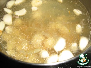 Затем обжаренный лук с чесноком (без масла) кладем в бульон (у меня куриный), добавляем остальной чеснок и варим на медленном огне 50 минут.