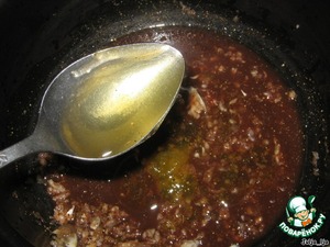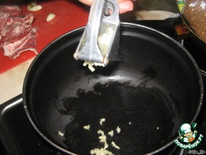Для начала приготовим маринад. Сразу в той посуде, где мясо будет мариноваться. Выдавливаем чеснок.