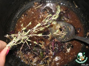 И тимьян. Хорошо всё перемешиваем. И немного нагреваем. Закипеть не даём, но чтобы всё было достаточно горячее.