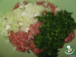 В фарш (домашний, смешанный 60% говядины и 40% свинины), добавляем мелко нарезанный лук и зелень. Можно добавить и чеснок, но я люблю без него. -