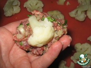 Теперь берём соцветие капусты и полностью покрываем его фаршем, скатываем в колобок.