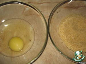 Для панировки, приготовим две мисочки. В одну яйцо, в другую сухари,панировочные. Я их делаю сама из домашних сухариков. Просто измельчаю их в блендере.