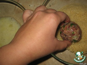 Окунаем шарики сначала в яйцо, потом в сухари.