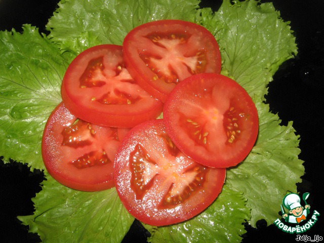Я салат делала порционно. На большую тарелку выложить листья салата. На них помидор, нарезанный кружками. Немного посолить и поперчить.