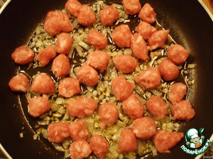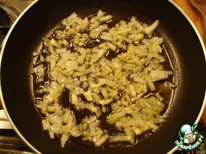 Нарезать мелко лук и пережарить немного на оливковом масле.