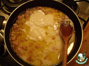 Затем добавить в колбаску грибы и сливки (у меня не было грибов, но были сливки со вкусом белого гриба), варить под крышкой ещё минут 5.