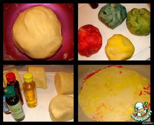 в каждую часть добавляем по 2 ч.л. пищевого красителя, размешиваем. У меня не получилось однородного цвета, как на картинке в рекламке, получились "мраморные" :)