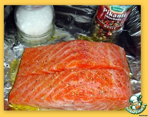 Филе лосося замариновать в смеси оливкового масла и лимонного сока минут на 10, посолить и поперчить.