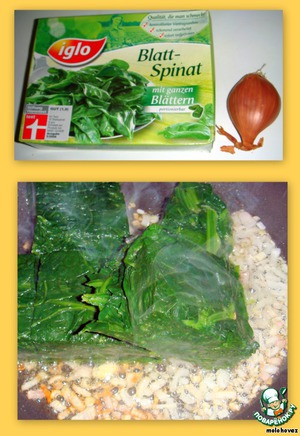 Обжарить мелко нарезанный лук и добавить к нему шпинат. Шпинат разобрать двумя вилками, посолить, поперчить и сбрызнуть соком лимона.