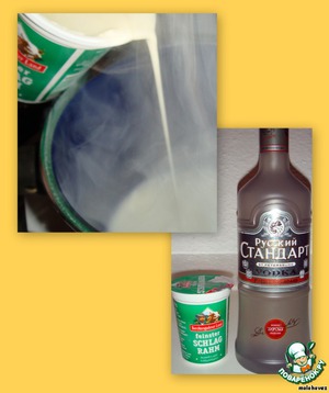 Сладкая парочка! Водку вылить в кастрюльку с толстым дном, разогреть и, постоянно помешивая, вливать сливки.
