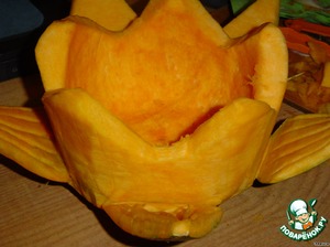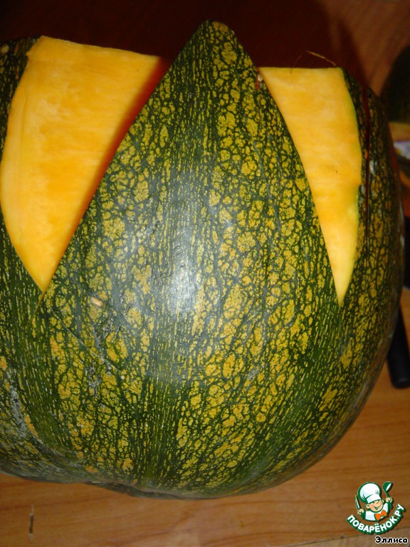 • Срезаем у тыквы верхушку, ложкой выскабливаем мякоть, оставляя стенки толщиной 2,5 - 3 см. Острым ножом делаем пять глубоких надрезов на внешней стороне тыквы.