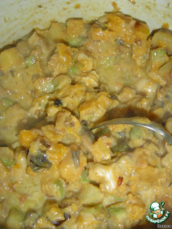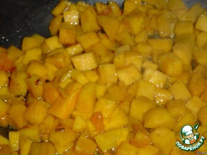 • Также поступаем с грибами, кабачками, луком, картофелем, сладким перцем и, конечно же, мякотью тыквы, вырезанной из середины тыквы и крышки.