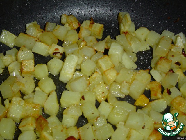 • Пока тыква запекается, готовим начинку. Режем курятину небольшими кубиками и обжариваем на растительном масле.