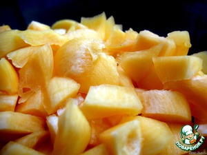Тыкву нарезать кубиками. Обжарить до готовности и отставить в сторону.