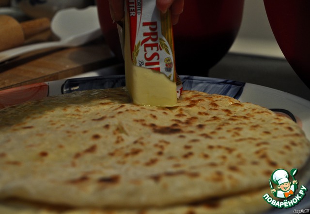 Снимите хичин со сковороды и сразу обильно помажьте сливочным маслом. Уделите особое внимание краям. |