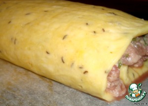 При помощи бумаги сворачиваем рулет. Прикрываем сверху бумагой для выпечки и отправляем в духовку на один час. Температура 180 градусов.