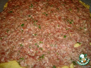 Пока корж запекается, добавляем в фарш чеснок, зелень, соль и перец по вкусу. Добавляем вино. Фарш должен быть жидковатым. Если он получается густой - добавьте еще вина или воды. На горячий корж выкладываем ровным слоем фарш.