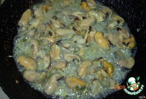 На сковороде разогреть масло ( сливочное и растительное), добавить мелко нарезанный чеснок и мидии, и обжарить в течение 5 минут. -