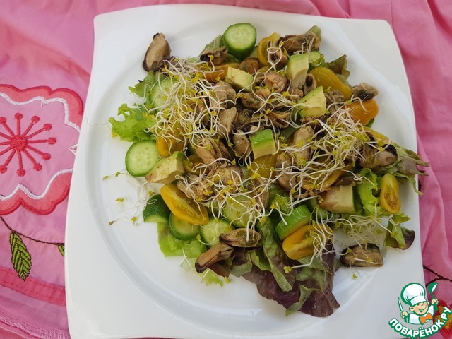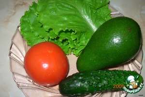 На блюдо выложить листья салата, огурец, помидор, авокадо и мидии.