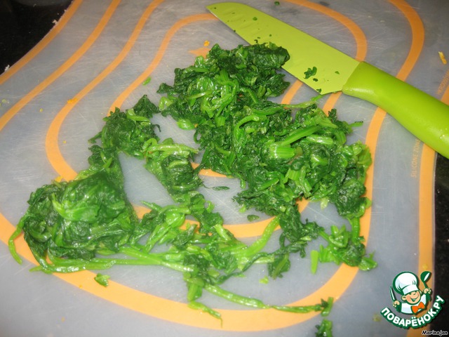 Шпинат отварить в подсоленной воде, откинуть на дуршлаг и под холодную воду /для цвета/.