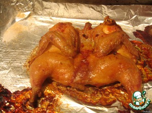 Курицу разрезать по брюшку, под кожу ввести пальцами выдавленный чеснок, смазать паприкой и растительным маслом.