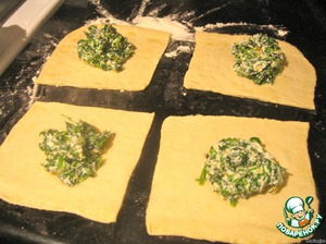 Тесто раскатать, разделить на квадраты, смазать белком и положить начинку.