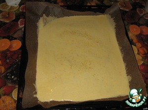 На противень укладываем лист бумаги для выпечки, на него выливаем жидкое тесто, равномерно распределяем ложкой и в духовку. Выпекаем при температуре 140 градусов 10-12 минут. |