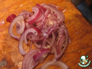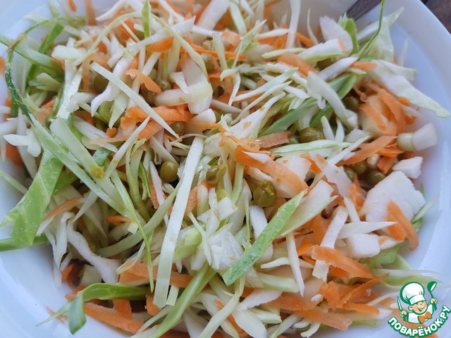 Сиреневый и зеленый лучок туда же. Добавляем горошек и зеленый лук.