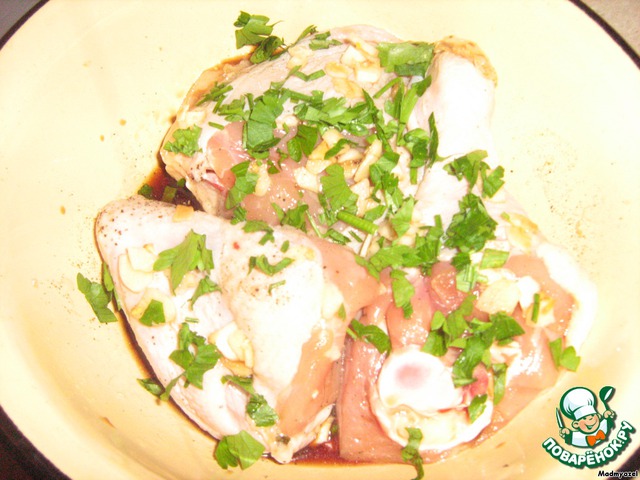 Из соевого соуса, соли, перца, чеснока и зелени сделайте соус - все смешайте и замаринуйте в этом курицу на 1-1,5 часа. |