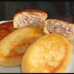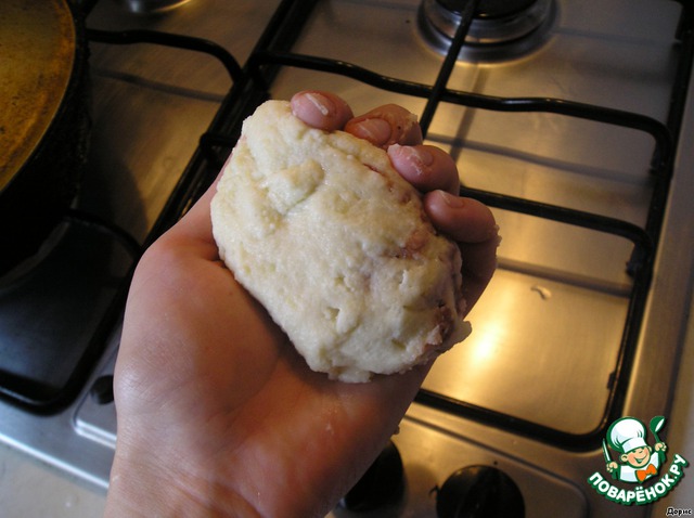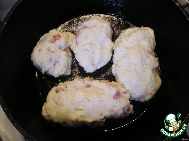 Вбить в пюре 2 яйца. Перемешать. Добавить муку. Смешать, чтоб густенькое было. Выложить на доску. Сверху - порция фарша, смешанного с выдавленным чесноком, перцем, солью и яйцом. Накрыть порцией картофельной массы, сформировать лепёшку.