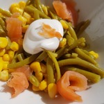 В миску выкладываем фасоль отварную, кукурузу консервированную, рыбу, порезанную кубиками.