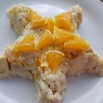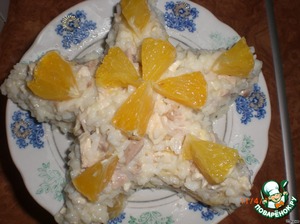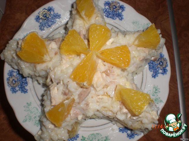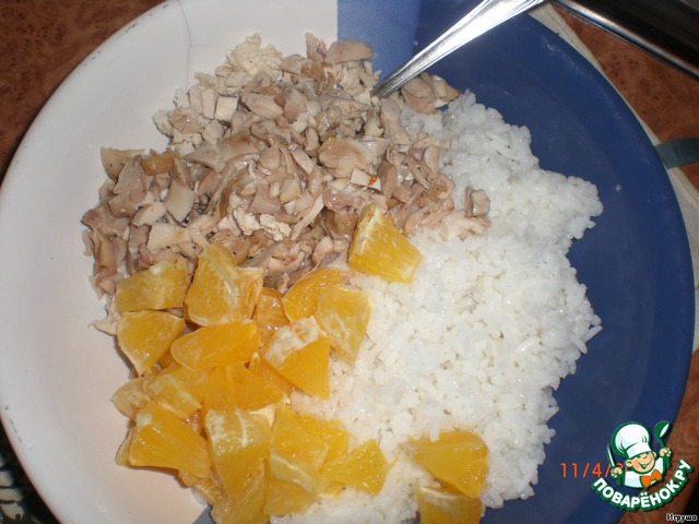 А теперь в миску кладём охлаждённый рис, куриное мясо, дольки апельсина. Добавляем соус, перемешиваем. Взбрызгиваем соком лимона и ставим в холодильник на 20 минут, чтобы настоялся.