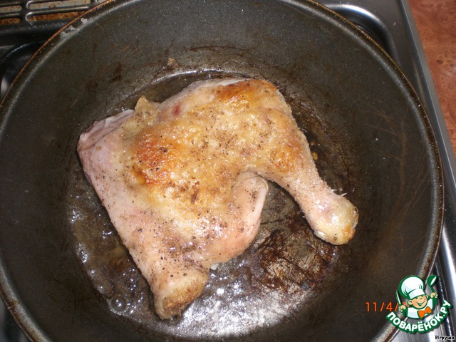 • Курицу (можно брать любые части курицы у меня был окорочок) пожарить до готовности. Мясо можно и отварить, кто как любит.