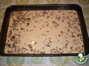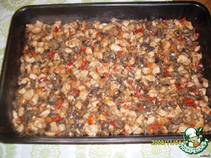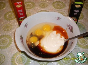 Приготовить заливку: взбить сметану, яйца, соевый соус и соус "Чили".