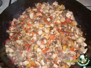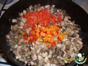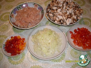 Куриное филе, грибы, лук, перец и помидоры порезать кубиками.