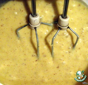 Муку и орехи высыпать в ёмкость с сахаром и яйцами. Взбить миксером.