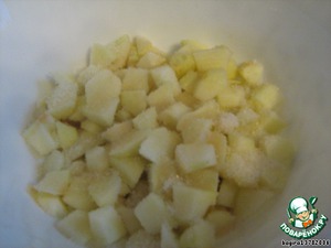 Пока крем остывает, чистим яблоки от кожуры, мелко режем, засыпаем сахаром и заливаем ромом(коньяком).