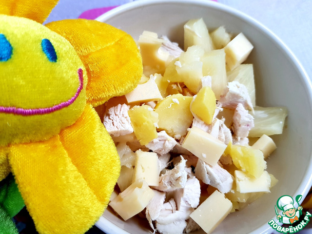 Очень популярный салат. Курица, ананас, сыр и... Но все делают его по-разному. А это мой вариант.