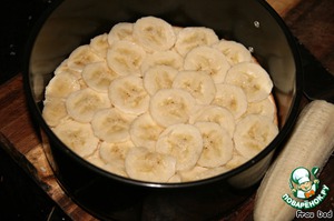 Вылить на слой бисквита немного сметанного крема, равномерно распределить. Сверху выложить слой нарезанных бананов (2,5 штуки).