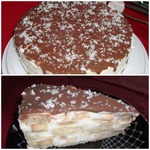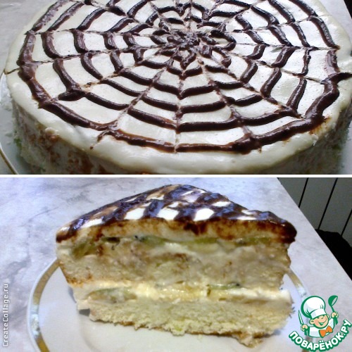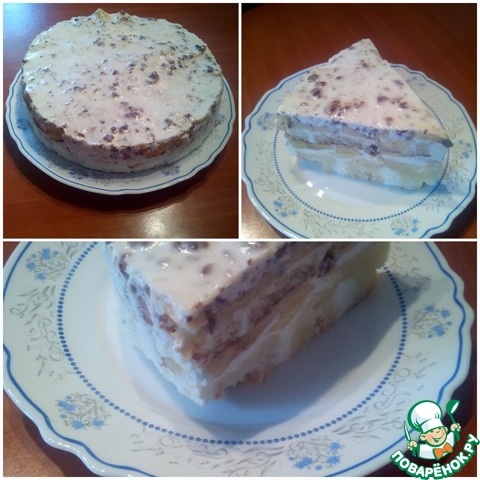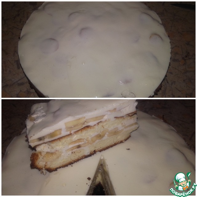 Бананы снова полить сметаной. Далее выложить еще один слой бисквита кубиками, полить сметаной, выложить бананами и залить оставшейся сметаной весь торт. Поставить в холодильник на 2 часа для застывания. Я делаю торт вечером и ставлю на ночь.